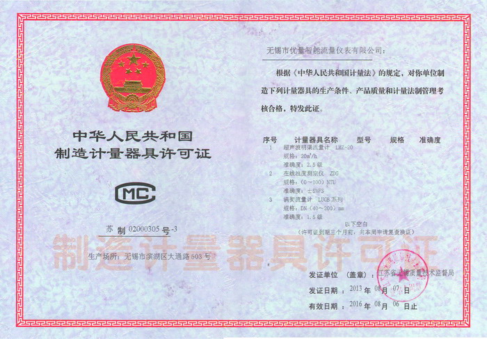 计量器具许可证:苏制02000305号-3 LUGB涡街流量计 ZDG在线浊度仪 LMZ超声波明渠流量计 |